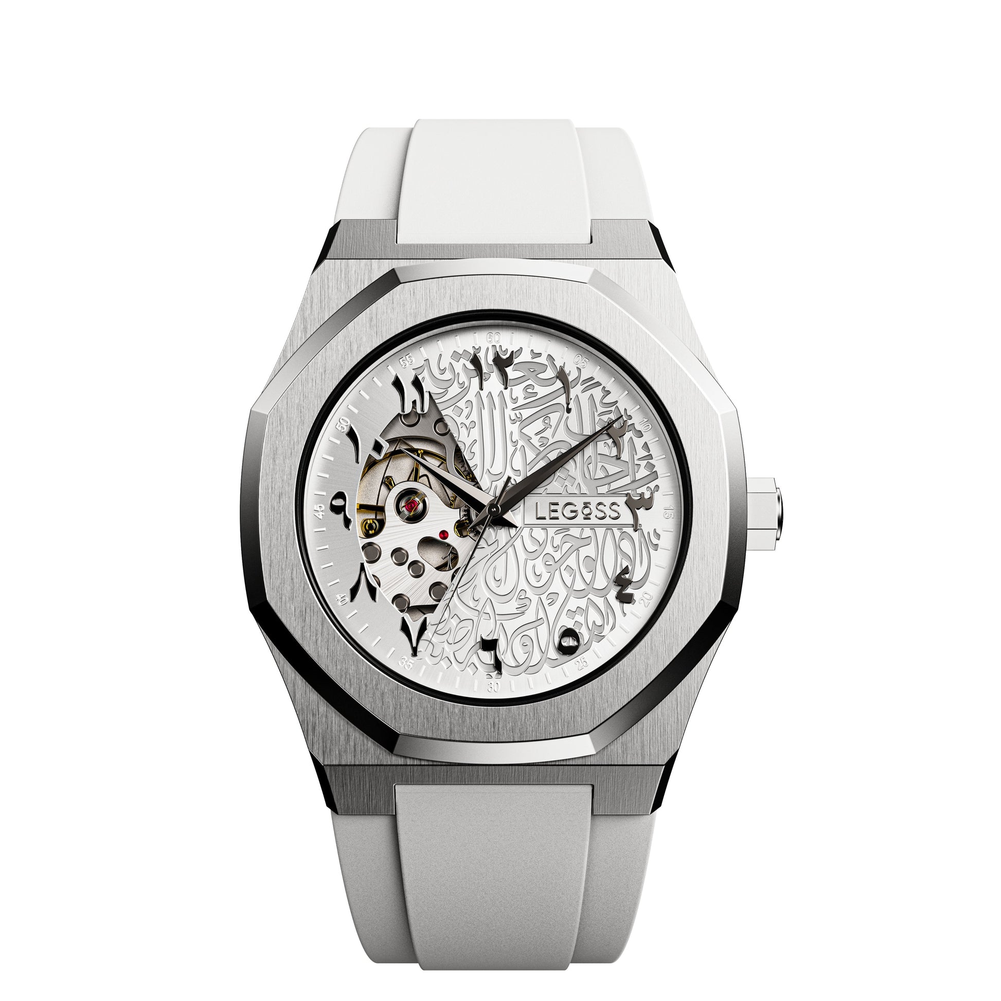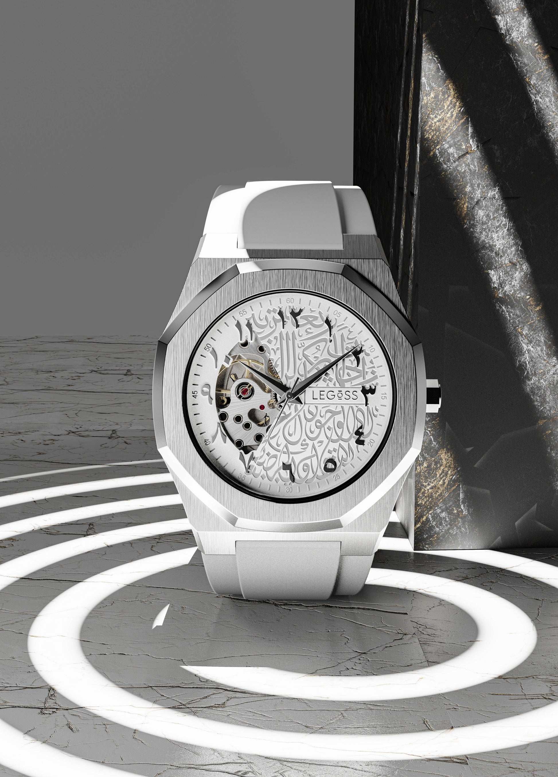 Eine polierte Lünette aus 314-Edelstahl umfasst das schlanke Zifferblatt und verleiht der Uhr einen königlichen Touch. Drei leuchtende Zeiger zeigen die Zeit an, während die charakteristischen silbernen LEGOSS-Zahnräder dem Zifferblatt einen Hauch von Farbe verleihen, geschützt durch kratzfestes Glas.