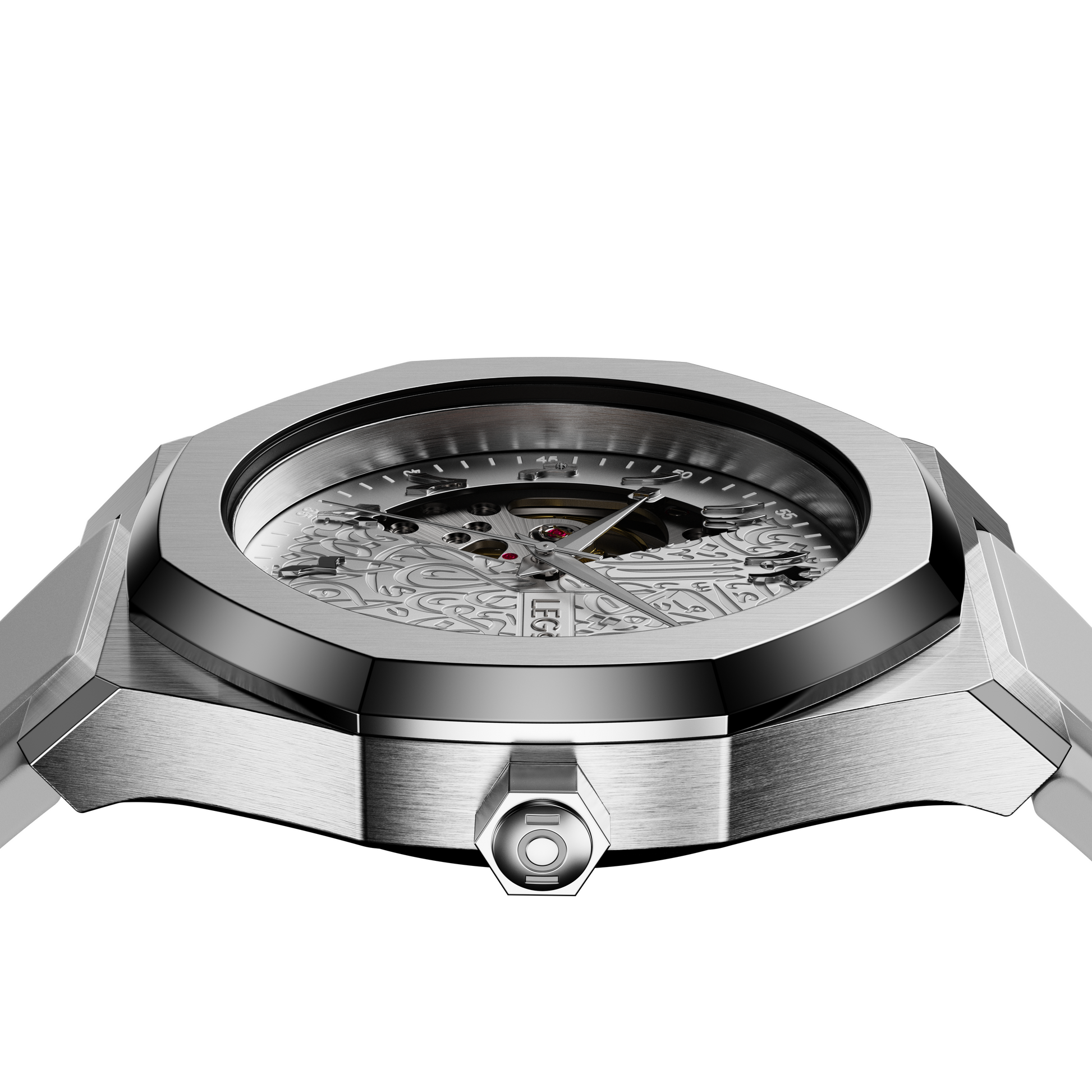 Die Kombination aus arabischer Kalligraphie und einem offenen Mechanismus ist pure Freude. Das schwarze Modell ist zweifellos das wertvollste Accessoire an Ihrem Handgelenk. Sein Charakter und sein Erscheinungsbild machen diese Uhr zu einem außergewöhnlichen Zeitmesser.