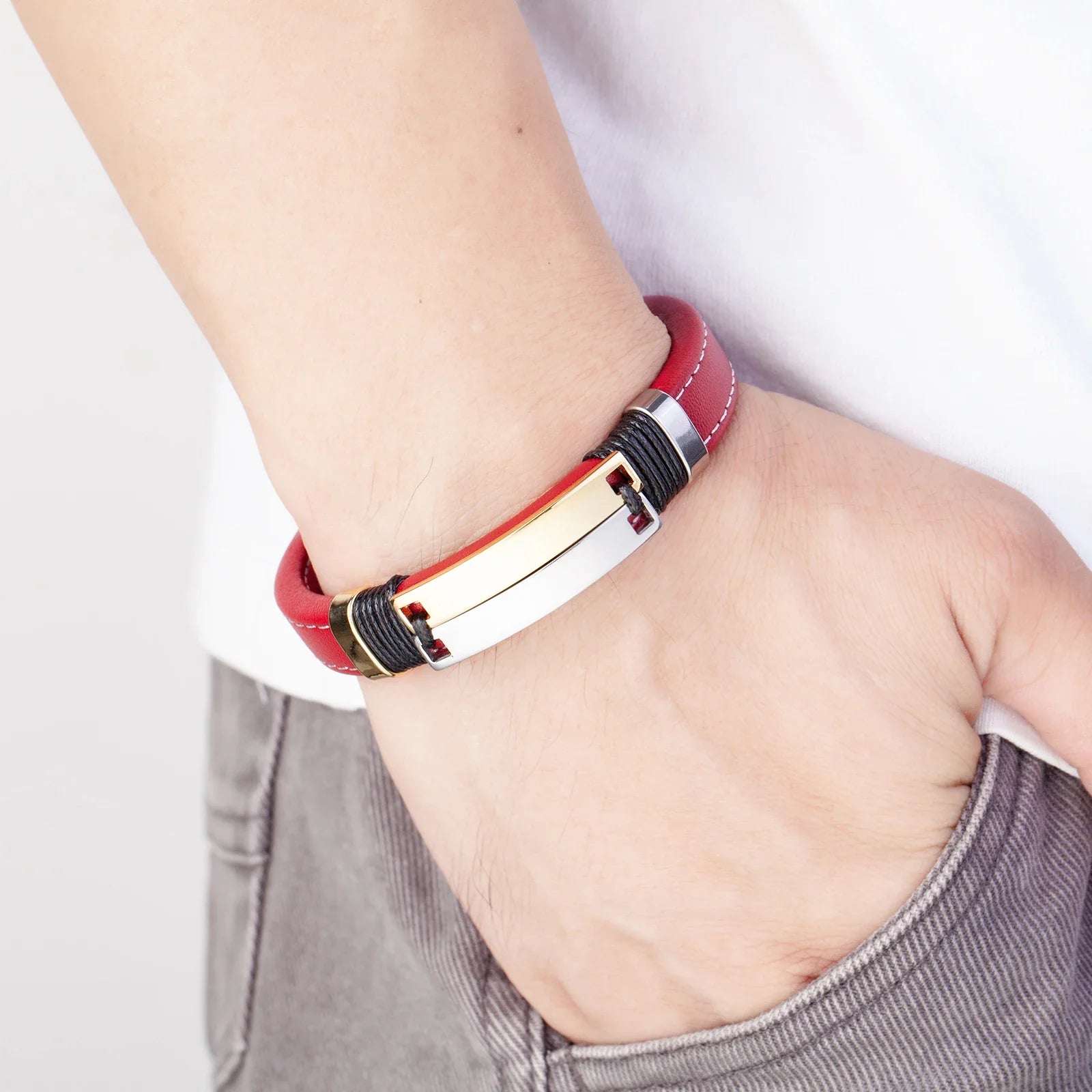 Make a bold fashion statement with the Caesarea Punk Double Row Bracelet, designed for men who embrace edgy style with modern elegance. This bracelet features a wide leather band combined with smooth, polished multicolor stainless steel links arranged in a striking double-row design. Its magnetic clasp ensures secure and easy wear while keeping the look sleek and sophisticated. Perfect for casual outfits, concerts, or adding a rebellious touch to everyday style.