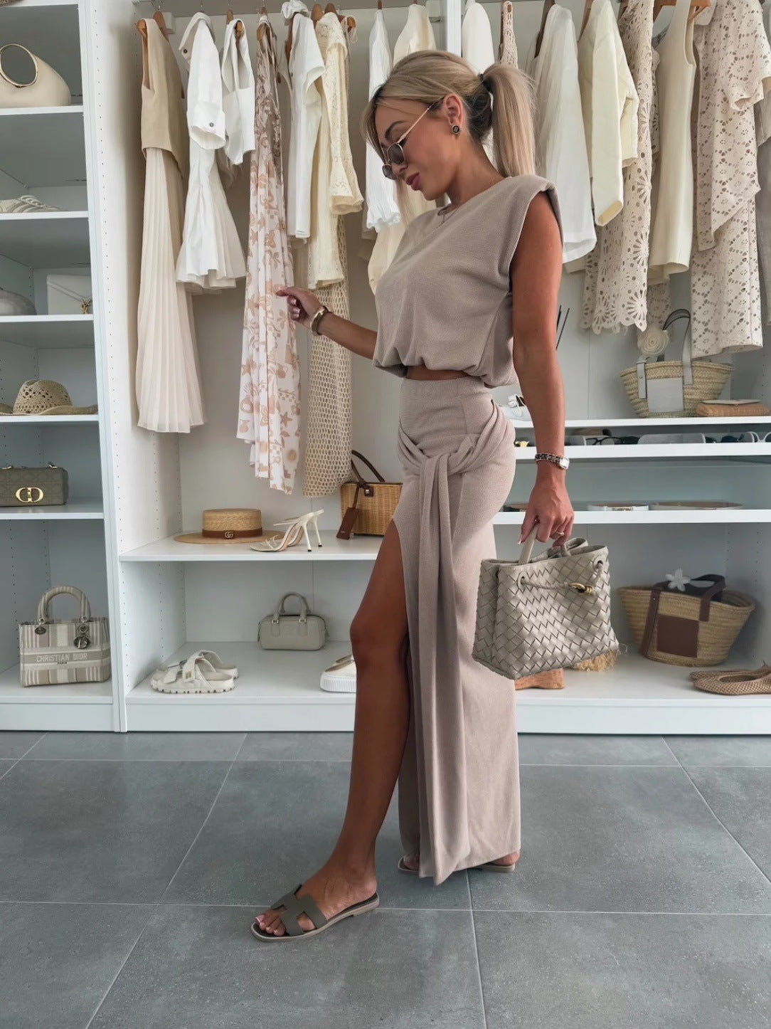 Das Luna Set besteht aus einem figurbetonten Top mit V-Ausschnitt und einem passenden Midirock, die gemeinsam eine harmonische Silhouette bilden. Der schmeichelnde Schnitt und das einheitliche Design wirken edel und modern – ideal für elegante Anlässe oder stilvolle Sommerabende.