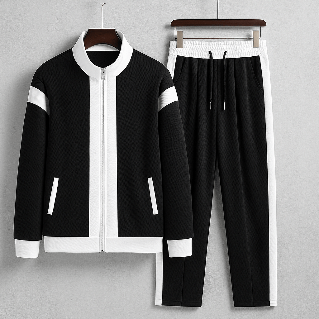 Ein Outfit, das alles mitmacht – vom morgendlichen Workout über Erledigungen am Nachmittag bis hin zum entspannten Abend auf dem Sofa. Dieser Trainingsanzug mit Kontrastdetails bietet sportlichen Komfort und ein markantes Zwei-Ton-Design, das bewusst und stilvoll wirkt – nicht nachlässig.