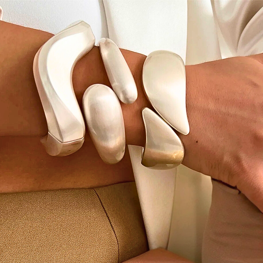 Setzen Sie ein mutiges Statement mit den Sienna Armreifen. Mit einem skulpturalen Design, matter Oberfläche und der Wahl zwischen Gold- oder Silbertönen kombinieren diese Armreifen mühelos moderne Kunstfertigkeit mit klassischer Eleganz. Perfekt, um sowohl lässige als auch formelle Looks aufzuwerten.